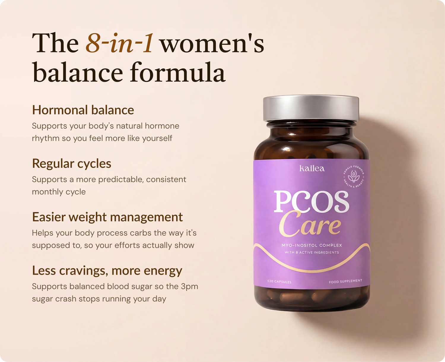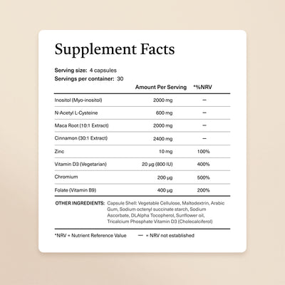 A natural blend of 8 active ingredients that support hormonal balance, metabolic health, energy and a regular cycle.